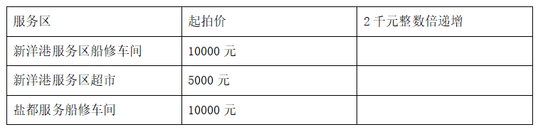 競拍形式:公開競拍,拍租期限為1年,每個服務區(qū)的競拍項第一年承租費起拍價為1萬元,按2千元整數(shù)倍遞增(如2000、4000、6000、8000……)。如下表: