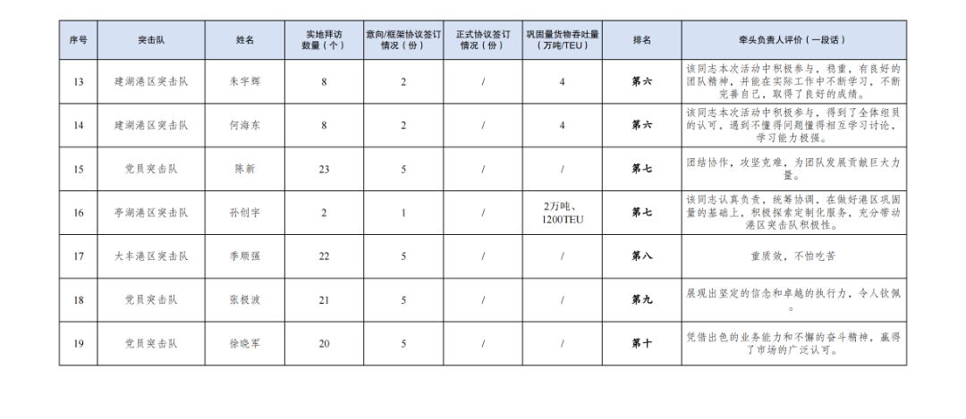 5.鞏固量貨物吞吐量11.3萬(wàn)噸、2655TEU:其中亭湖港區(qū)突擊隊(duì)7.3萬(wàn)噸、2655TEU,建湖港區(qū)突擊隊(duì)4萬(wàn)噸。