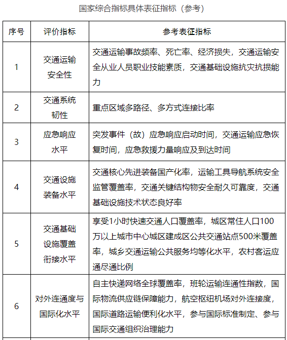 為貫徹落實《交通強國建設(shè)綱要》《國家綜合立體交通網(wǎng)規(guī)劃綱要》,客觀評估交通強國建設(shè)進程和開展國際對標(biāo),科學(xué)引導(dǎo)各地區(qū)、各行業(yè)加快建設(shè)交通強國,充分發(fā)揮交通強國建設(shè)評價指標(biāo)體系的“標(biāo)尺”和“指揮棒”作用,制定本指標(biāo)體系。