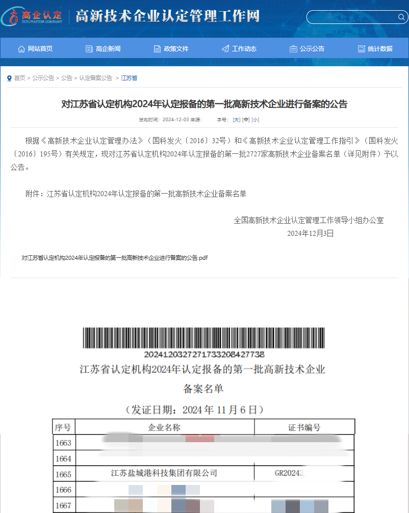近日,鹽城港科技集團成功通過“高新技術企業”認定,標志著公司科技創新工作取得了新進展,鹽城港集團科技創新邁入了新階段。