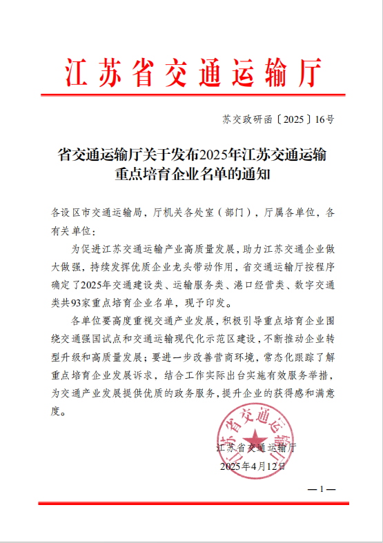 喜報!智慧港口公司入選2025年江蘇交通運輸重點培育企業