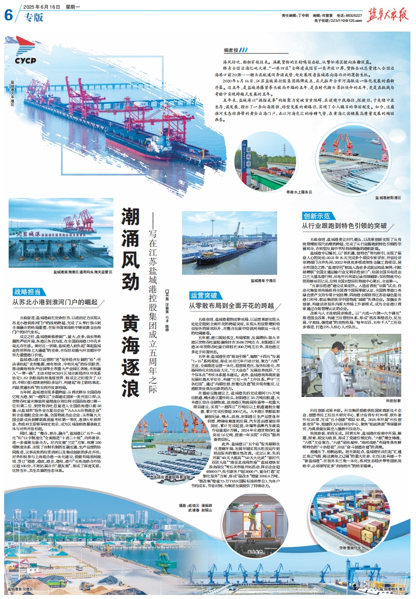 五年間,鹽城港實現多重跨越:從首次躋身全國沿海億噸大港,到“一港四區”全部建成國家一類開放口岸;從貨物吞吐量和集裝箱量增速分別位列全國沿海港口第一位和第二位,到貨物吞吐總量進入全國沿海港口前20強;從鹽城市“服務業五星級企業”“AAAA級物流企業”到全省港航企業20強、全國物流杰出企業;從市屬九大國企新成員到蟬聯高質量考核第一等次,連續5年獲市委、市政府主要領導肯定批示,成為區域戰略資源承載主體與對外開放樞紐。