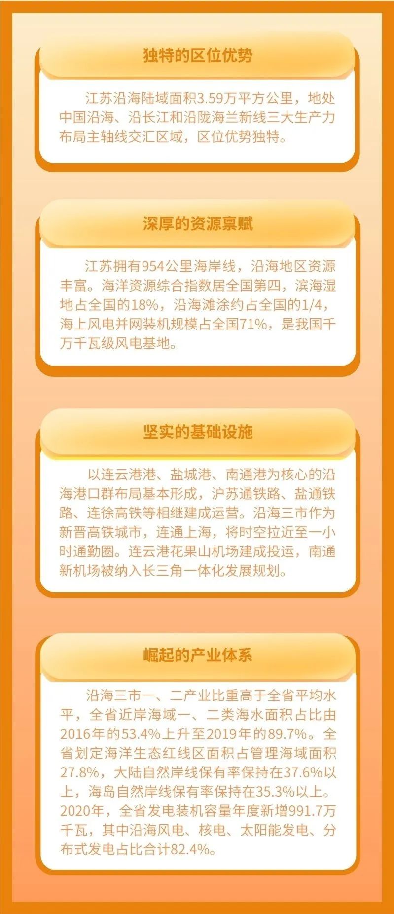 江蘇“十四五”規(guī)劃綱要明確,沿海地區(qū)深化港產城融合發(fā)展,著力提升海洋經濟、生態(tài)經濟和樞紐經濟,打造令人向往的生態(tài)風光帶、人海和諧的藍色經濟帶,成為新的增長極。江蘇省第十四次黨代會提出,全力推進沿海地區(qū)高質量發(fā)展,加快陸海統(tǒng)籌發(fā)展,大力發(fā)展海洋經濟,著力塑造“繽紛百里”“生態(tài)百里”“藍灣百里”濱海特色風貌,努力把沿海地區(qū)打造成綠色生態(tài)高質量發(fā)展經濟帶。
