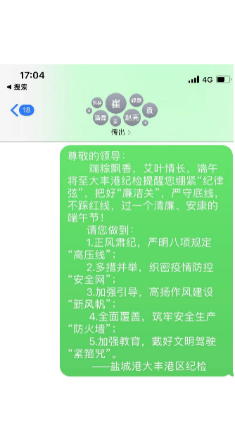 鹽城港大豐港區紀檢精心編輯與廉潔從政、清廉家風有關的廉政短信和廉潔提醒,在元旦、春節、清明、端午等重要節點前發送給全體干部職工,教育警示廣大干部職工知敬畏、存戒懼、守底線。
