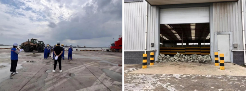 演練模擬安全環(huán)保部人員接到上級氣象災(zāi)害預(yù)警通知,我區(qū)域?qū)⒊霈F(xiàn)強(qiáng)降水、8級以上雷暴大風(fēng)極端天氣。接到通知后,相關(guān)部門立即停止室外作業(yè),緊急啟動《防臺防汛應(yīng)急預(yù)案》。門機(jī)防風(fēng)演練現(xiàn)場,應(yīng)急演練人員打開隱藏式坑位蓋板,門機(jī)移機(jī)定位、下錨定插板、加固防風(fēng)拉索,快速完成單臺門機(jī)防風(fēng)加固任務(wù)。物流園防汛演練現(xiàn)場,搶險(xiǎn)人員對室外堆場進(jìn)行針對性排水,并用沙袋將倉庫、配電房等重點(diǎn)部位進(jìn)行封堵,迅速完成防洪墻堆建。