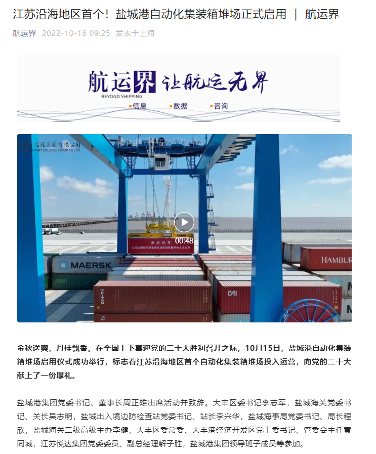 江蘇沿海地區(qū)首個(gè)自動(dòng)化集裝箱堆場(chǎng)——鹽城港大豐港區(qū)自動(dòng)化集裝箱堆場(chǎng)正式啟用