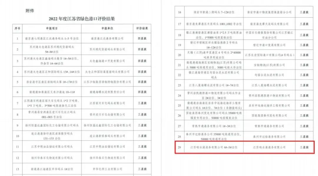 12月21日,2022年度江蘇省綠色港口評價結果揭曉,江蘇響水港港務有限公司4#-5#泊位獲得“江蘇省三星級綠色港口”榮譽稱號。