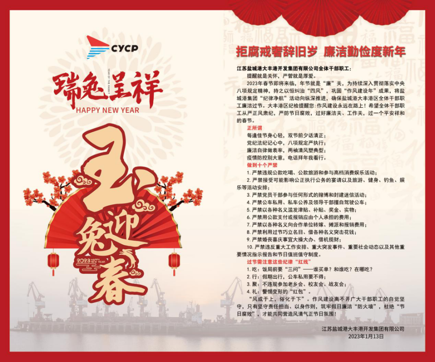 為營造春節前后風清氣正、平安祥和的良好氛圍,大豐港開發集團紀檢緊盯節前、節中、節后重要環節,打好節點“四風”五步走組合拳。