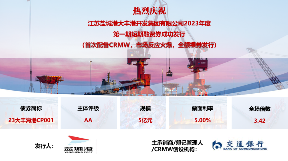 4月28日,大豐港開發集團2023年度第一期短期融資券成功發行,發行規模5億元,發行利率5%,全場認購3.42倍,創大豐港開發集團近幾年來債券融資成本最低。本期債券,創新通過交通銀行風險緩釋憑證吸引了投資熱度。債券的成功發行充分反映了投資機構對鹽城港集團發展的高度認可,進一步提振了資本市場對鹽城港航事業發展的信心。