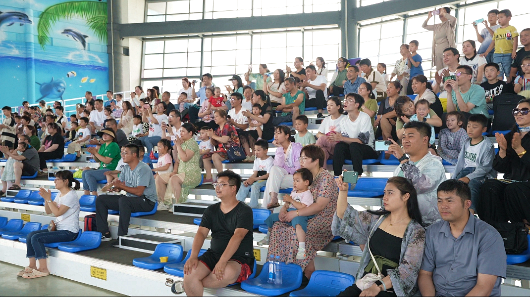 在海洋世界里,可愛的海豚在馴養(yǎng)員的指揮下盡情地舞動著,從水中一躍而上而又輕輕落入水中,展現(xiàn)著靈活的身姿。海豚的精彩表演和與觀眾的親密互動,贏得游客陣陣喝彩和掌聲。