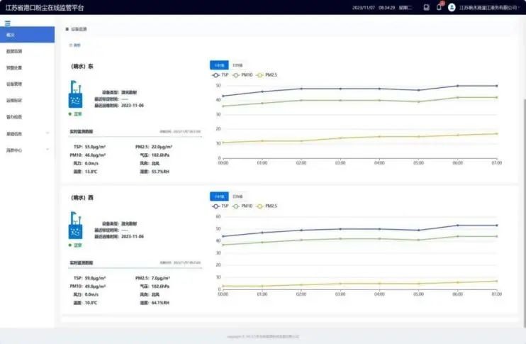 基于激光散射的監測設備和江蘇省港口粉塵在線監管系統上線后,通過碼頭東側和西側的2個揚塵在線監測儀,能掃描整個散貨作業碼頭,實時獲得碼頭作業區的PM2.5、PM10、TSP總懸浮顆粒物濃度數據,實現碼頭全域100%監測全覆蓋。