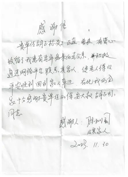 一個中午,響水港區(qū)灌江港務(wù)分公司保安隊長胡正標(biāo)發(fā)現(xiàn)一位近八旬的老人在碼頭南側(cè)馬路上徘徊且沒有立即離開跡象,便好心上前詢問交流。該位老人冬日里衣著單薄且神志有些不清,問其姓名、家庭住址等信息,老人都言語不佳,回答不出來,且身上沒有任何證件或物件能證明其身份的。于是胡隊長將其邀請至保安室內(nèi)暖和休息,為他送上熱茶和充饑食物,熱情安撫老人情緒。隨后胡隊長撥通報警電話,并將老人照片發(fā)到附近周圍社區(qū)微信群中,很快群內(nèi)有位社區(qū)居民認(rèn)出該位老人。最終在社區(qū)居民的幫助下,聯(lián)系上了老人家屬。在半小時后,老人家屬趕到碼頭接到老人平安回家。在與老人家屬交談中得知,該老人從當(dāng)日早上出門便遲遲未歸家,家人一直在焦急尋找中。針對胡正標(biāo)隊長的熱心行為,老人家屬萬分感謝。冬日里的這份愛心行為,暖心又暖情,讓這個寒冷的冬日有了暖陽般的溫馨。