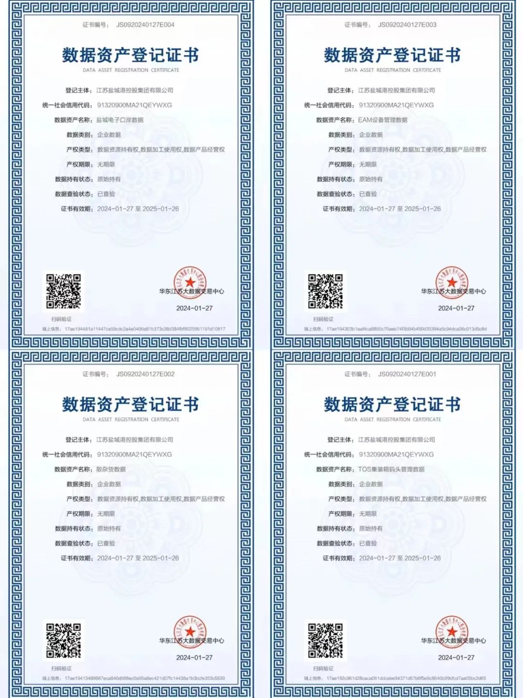 日前,鹽城港集團(tuán)順利完成集裝箱碼頭生產(chǎn)操作系統(tǒng)(TOS)、電子口岸系統(tǒng)、港機(jī)設(shè)備物資管理系統(tǒng)(EAM)、散雜貨生產(chǎn)管理系統(tǒng)(MES)數(shù)據(jù)資產(chǎn)質(zhì)量評(píng)價(jià)及價(jià)值評(píng)估,并獲得《數(shù)據(jù)資產(chǎn)登記證書》,成為鹽城市首批完成數(shù)據(jù)資產(chǎn)登記的企業(yè)之一,也是全國首個(gè)港口企業(yè)數(shù)據(jù)資源入表案例。