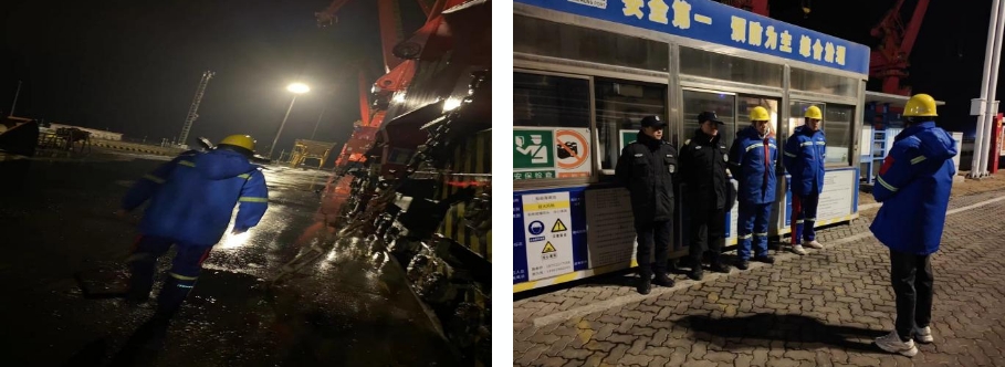 是班組長、是設(shè)備保障員,也是黨員。“我是黨員我先上”是我們每個人的行為準(zhǔn)則。寒潮來臨前,他們仔細(xì)檢查門機(jī)錨定插板、防風(fēng)拉鎖、防爬器、鐵楔是否完全插入槽內(nèi);利用加桿檢查鏈條連接環(huán)是否受力至最大值;嚴(yán)格檢測防爬器是否落地牢靠;確保惡劣天氣下港區(qū)安全有序。