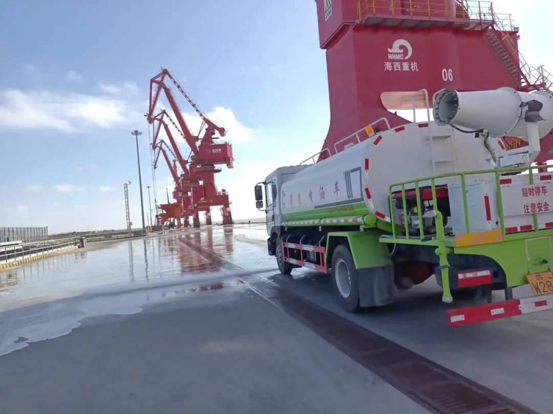 在碼頭散貨裝卸過程中實施全程水霧抑塵與作業噴淋管理;散貨堆場堆碼嚴格做到全面、及時苫蓋;明確運輸車輛封閉性、貨物苫蓋、裝貨高度以及車輪沖洗等規定;港區內道路全天保證完整濕式清掃4次以上,白天實行不間斷灑水。確保在“生產性”揚塵形成初期,編織起一張“立體防護網”。
