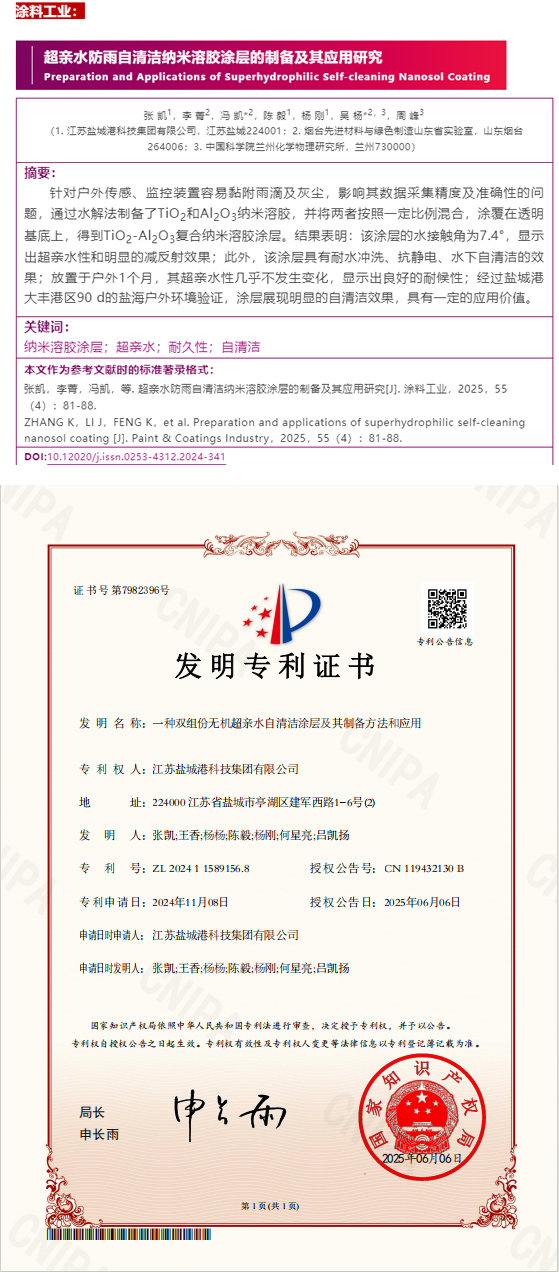 近日,由科技集團組織研究的《鹽海港口感知傳感器鏡頭表面的防雨涂層研究》科技創新課題成功取得了2項知識產權,并在大豐港集裝箱自動化堆場試驗成功,標志著創新成果轉化應用取得新突破。