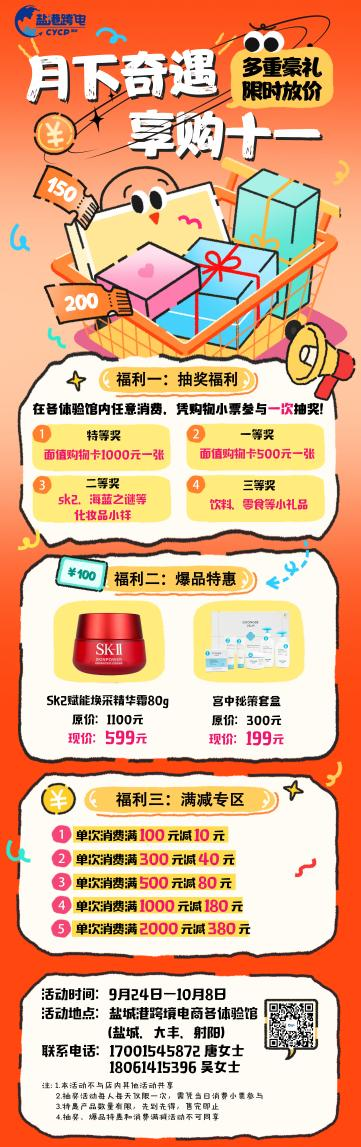莎士比亞跨境電商國際商貿小鎮將于2025年9月24日至10月8日推出以“月下奇遇,享購十一”為主題的系列促銷活動?;顒悠陂g,消費者可在鹽城、大豐、射陽三地的跨境電商體驗館享受多重福利:消費即可參與100%中獎抽獎,獎品涵蓋千元購物卡、熱門美妝小樣等;單筆消費滿100元起即可參與多檔滿減優惠,最高立減380元;更有爆款單品直降促銷,如SK2賦能煥采精華霜由原價1100元優惠至599元,誠意回饋顧客。本次活動通過線上線下多渠道聯動宣傳,并提前備足貨源、優化服務流程,力求為消費者帶來優質、便捷的購物體驗,進一步激發節日消費市場活力。