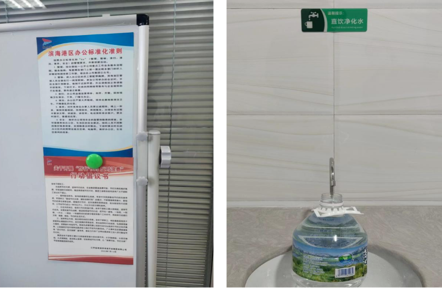 與此同時,濱海港區(qū)還在宿舍生活集聚區(qū)、辦公區(qū)各樓層共安裝了7臺凈化飲水機,一改過去瓶裝用水浪費現(xiàn)象的發(fā)生,弘揚了節(jié)儉美德,杜絕了鋪張浪費。對公眾場所場地用水處,放置了反對浪費、節(jié)約為榮,惜水、愛水(節(jié)水,從我做起)、安全用電等宣傳標牌,以多種形式營造綠色節(jié)儉、文明用水、安全用電的勤儉氛圍。