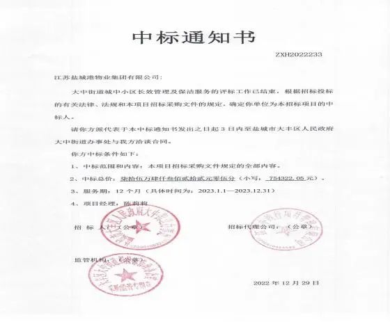 拓市場,保增長,項目業績創一流。實業集團在提升物業服務質量、房屋租賃水平,擴大鹽城港集團“內循環”的同時,逐步向外部市場拓展。1月,黃海港城公司與中天大豐電纜有限公司成功簽訂員工宿舍租賃存量住宅業務合同,合同金額近30萬元。物業公司成功中標大中街道城中小區長效管理及保潔服務,中標價約75萬元。