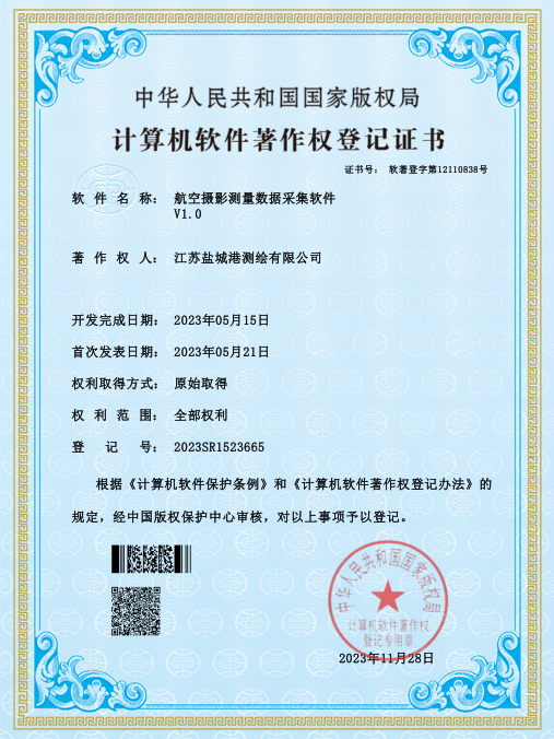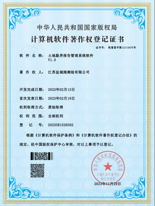 鹽城港港航勘測設計公司一直高度重視技術發展創新和知識產權保護,現已獲得測繪OA綜合管理系統軟件、地形測量數據處理與繪圖成圖系統、航空攝影測量數據采集軟件、三維建模數據處理和信息管理軟件、土地勘界報告管理系統軟件五項軟件著作權。