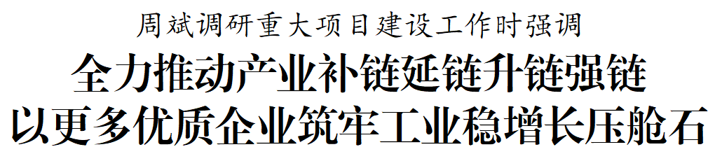周斌在調研中強調,重大項目是撐起我市經濟社會發展的“硬脊梁”。各地各部門要切實增強責任感緊迫感,牢固樹立“項目為王”理念,圍繞“5+2”戰略性新興產業和23條重點產業鏈,持續掀起招商引資和項目推進熱潮,夯實高質量發展的根基。圍繞推進新型工業化與新質生產力良性互動,搶抓大規模設備更新等機遇,推動制造業技術改造升級,實現高端化、智能化、綠色化發展,大力構建現代化產業體系。要做好為企服務,擦亮“鹽誠辦”金字招牌,抓好企業發展“三件事”,助力企業各展所長、深化合作,全面激發發展的內生動力和活力。