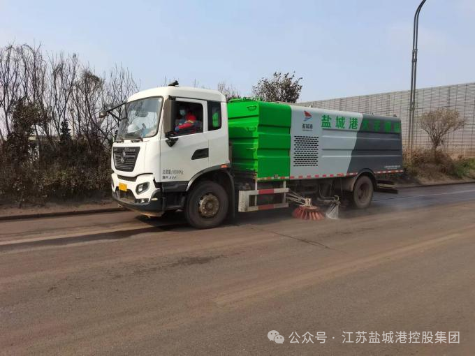 灑水車來回穿梭于港區(qū)道路上
