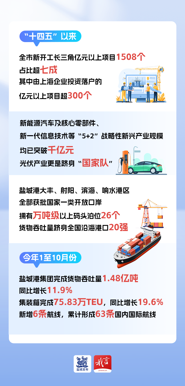 港口能級的持續提升,進一步強化了鹽城的門戶地位。鹽城港大豐、射陽、濱海、響水港區全部獲批國家一類開放口岸,擁有萬噸級以上碼頭泊位26個,貨物吞吐量躋身全國沿海港口20強。今年1至10月份,鹽城港集團完成貨物吞吐量1.48億噸,同比增長11.9%,集裝箱完成75.83萬TEU,同比增長19.6%新增6條航線,累計形成63條國內國際航線,其中“滬鹽”航線實現“天天班”,成為區域協同降本增效的典范。