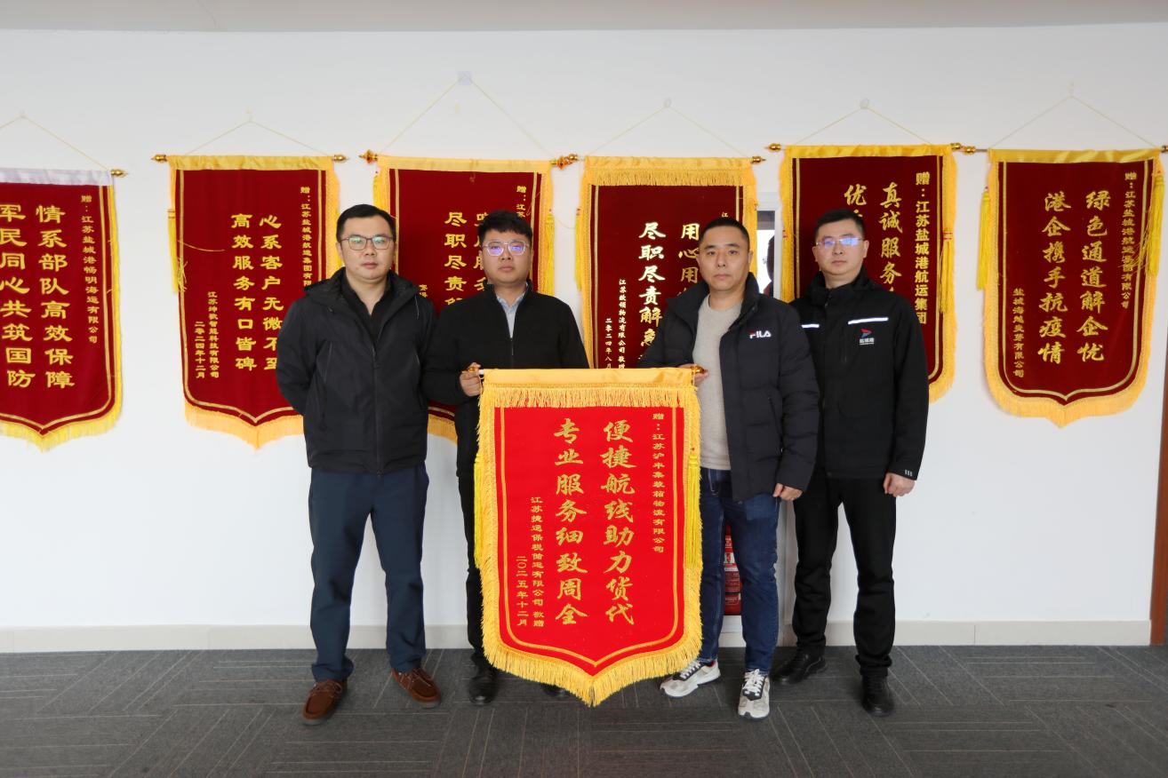 近日,航運集團接連收獲兩份滿載認可與情誼的暖心“禮物”——江蘇博匯紙業有限公司、江蘇捷通保稅儲運有限公司先后將燙金錦旗送至公司,不僅是對航運集團近期服務成效的高度肯定,更印證了其“十四五”期間暖心服務的堅實成果與深厚口碑。