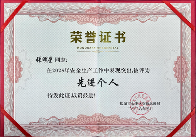 近日,鹽城港港口危化品運輸有限公司憑借扎實有效的安全生產管理工作、突出的安全風險防控成效,榮獲大豐區交通局授予的“2025年安全生產工作先進集體”榮譽稱號,用責任與擔當樹立了危化品行業安全規范經營的標桿。